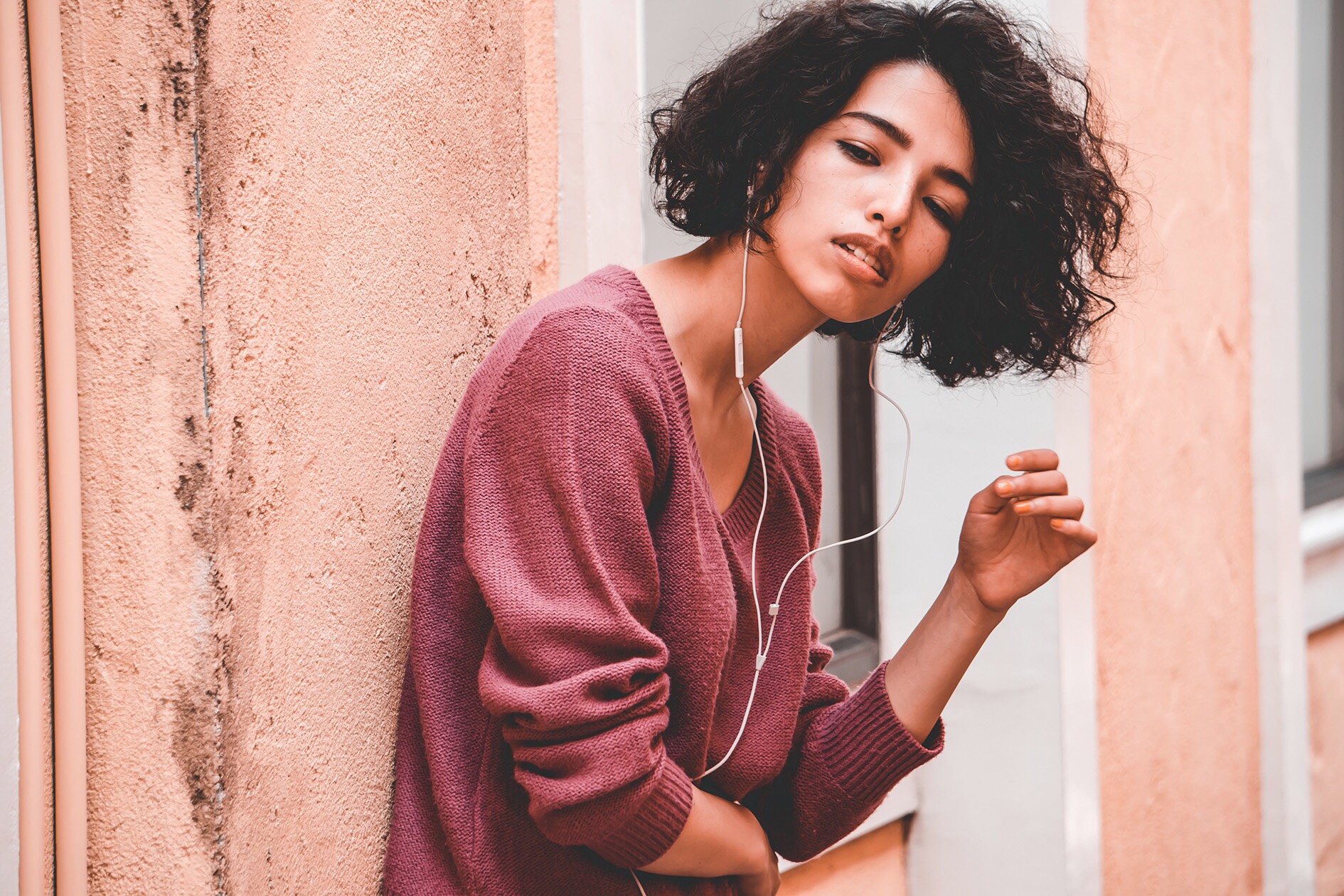 二枚目はイヤフォンにフォーカスした撮影で、コードまでがきれいに見えるように、上にボリュームを持ってきました。この方はもともとナチュラルウェーブだったんですが、ピンキーアイロンで細かく巻き、