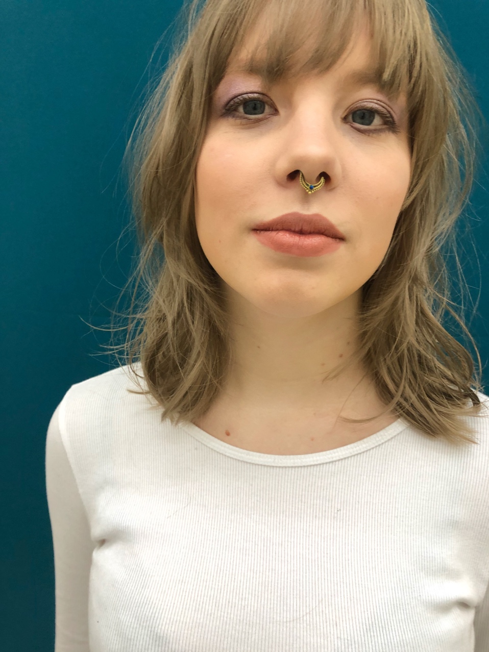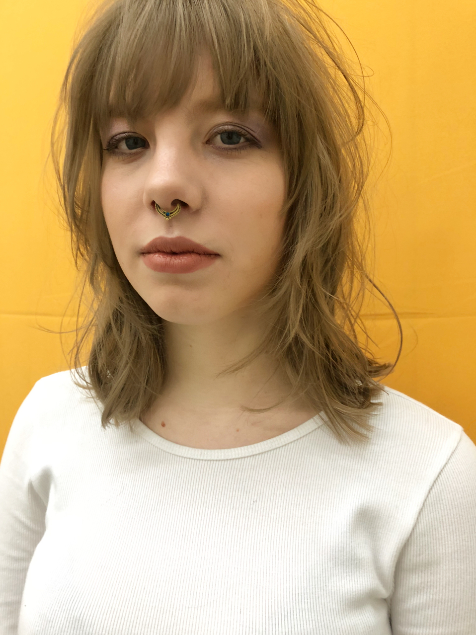 彼女は髪を伸ばしていて、長さを切ることはできなかったので、前髪を作りそこに向かってレイヤーをいれました。